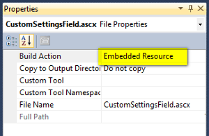 Next you need to change the “CustomSettingsField.ascx“and “CustomSettingsField.js” files to be Embedded Resources. Within your Visual Studio solution, right click on the “CustomSettingsField.ascx” file, and select “Properties”.