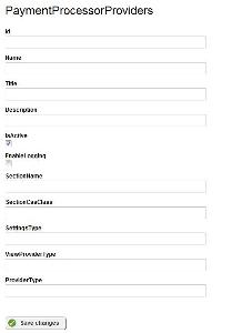 To add a new Payment Processor Click on Create New button in the PaymentProcessorProviders area.
