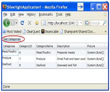 You'll next need to modify the Mainpage.xaml which defines our Silverlight UI. Notice it has a "Get Categories" button and a Data Grid with title "Categories". [cc lang="xml" line_numbers="false"]