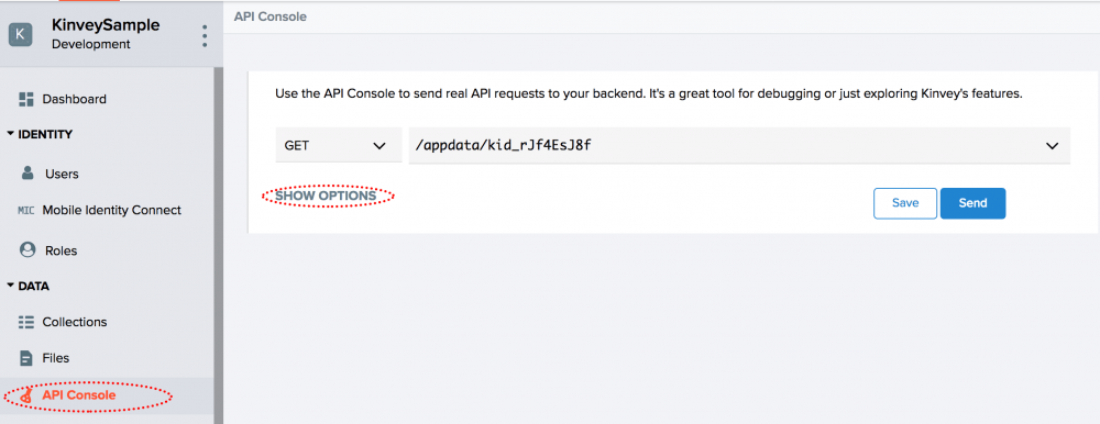 From within the Kinvey browser console, click on the “API Console” option and then click on the “Show Options” link.