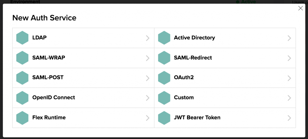 From within the Kinvey web console, you’ll want to choose the Mobile Identity Connect option from the left-hand navigation. Next click the “Add Auth Service” button. From there you will see all of the options discussed earlier in this article.