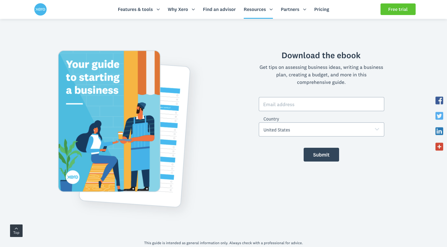 Xero asks interested readers to download the "Your guide to starting a business" ebook.