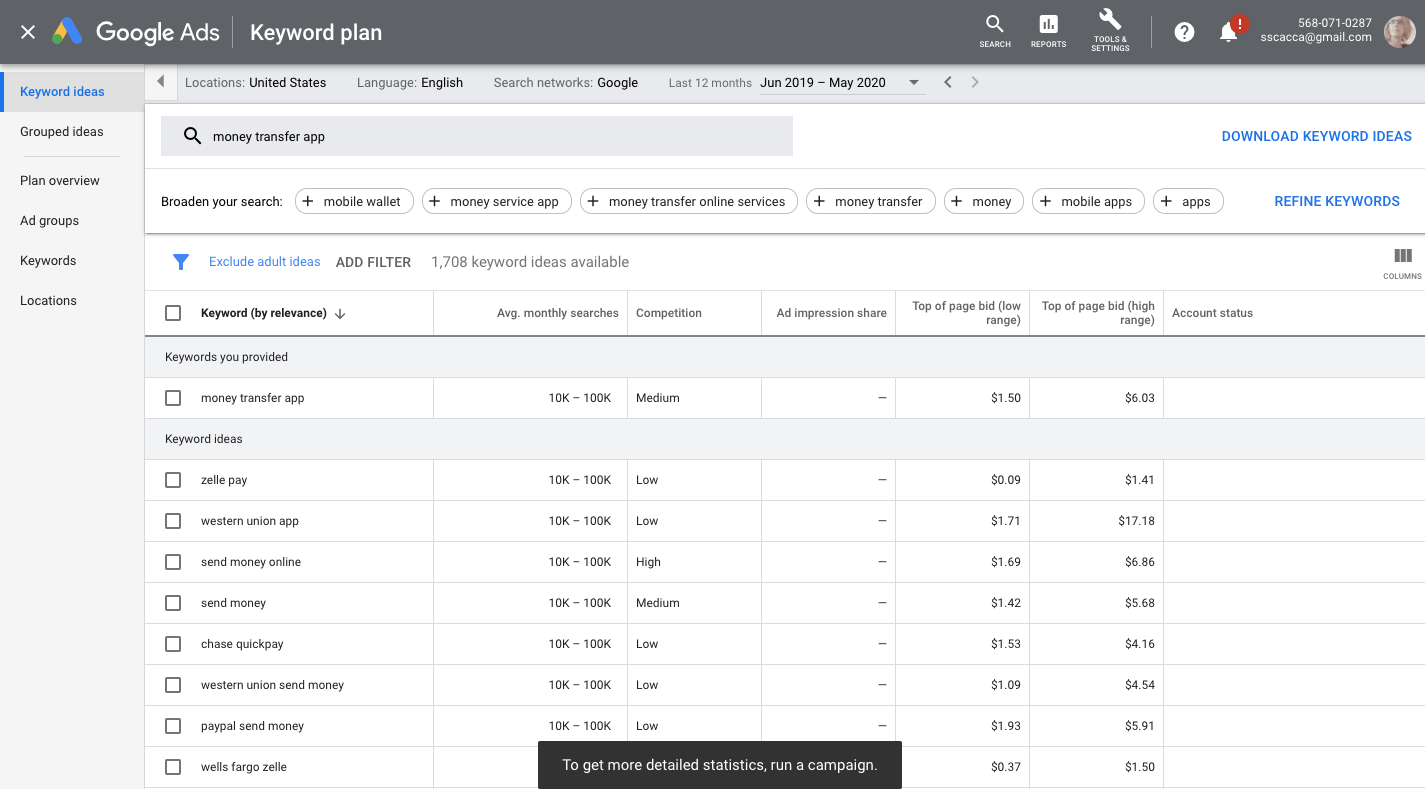 A search for “money transfer app” in the Google Keyword Planner yields over 1,700 matching keywords ideas.
