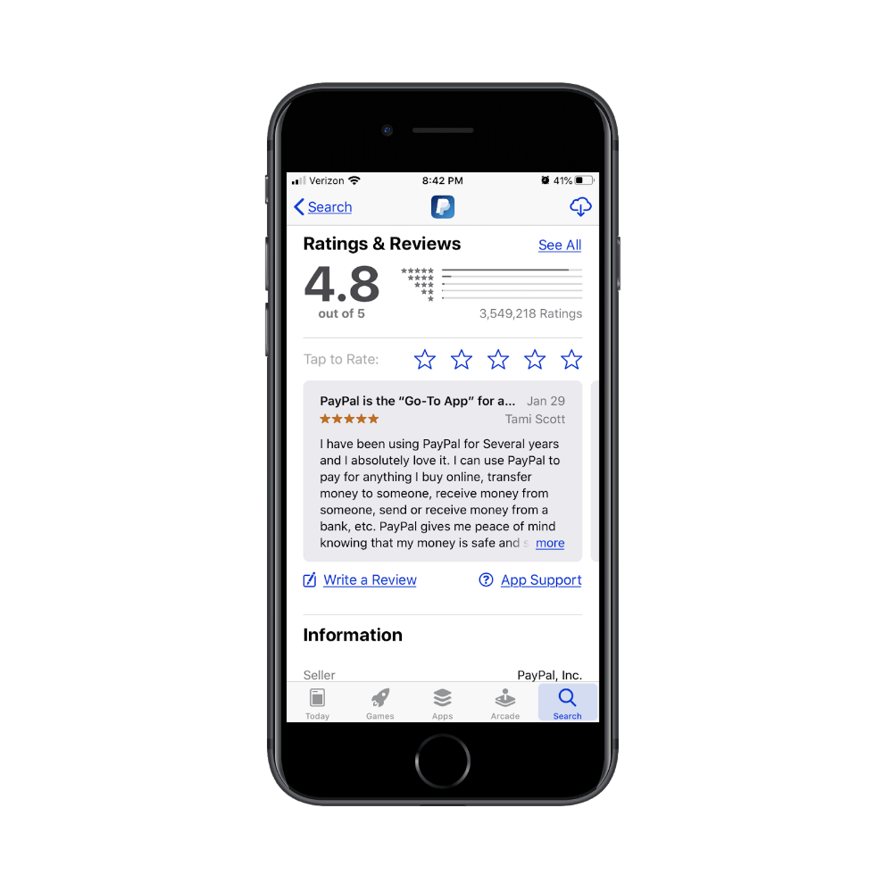 A user left a positive review for the PayPal mobile cash app and how easy it is to transfer money to other people.
