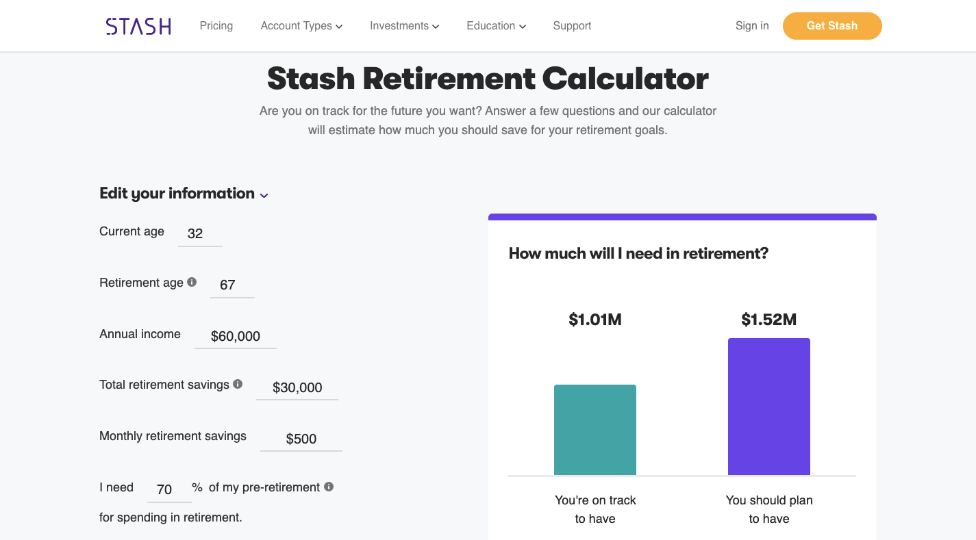 Stash visitors input their personal info into the retirement calculator to see how much they will need in retirement.