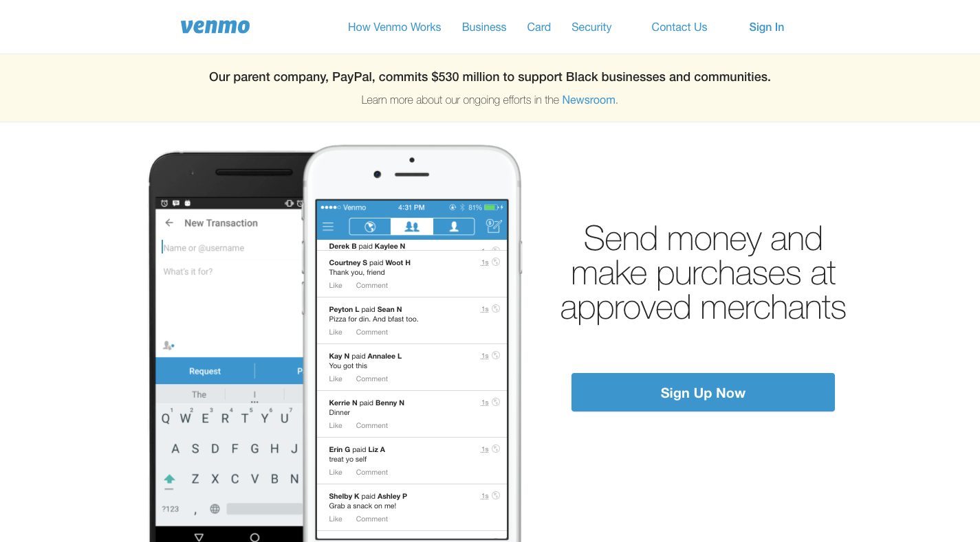 The Venmo landing page shows a GIF of the app in action and lets prospects know they can "send money and make purchases at approved merchants" with it.