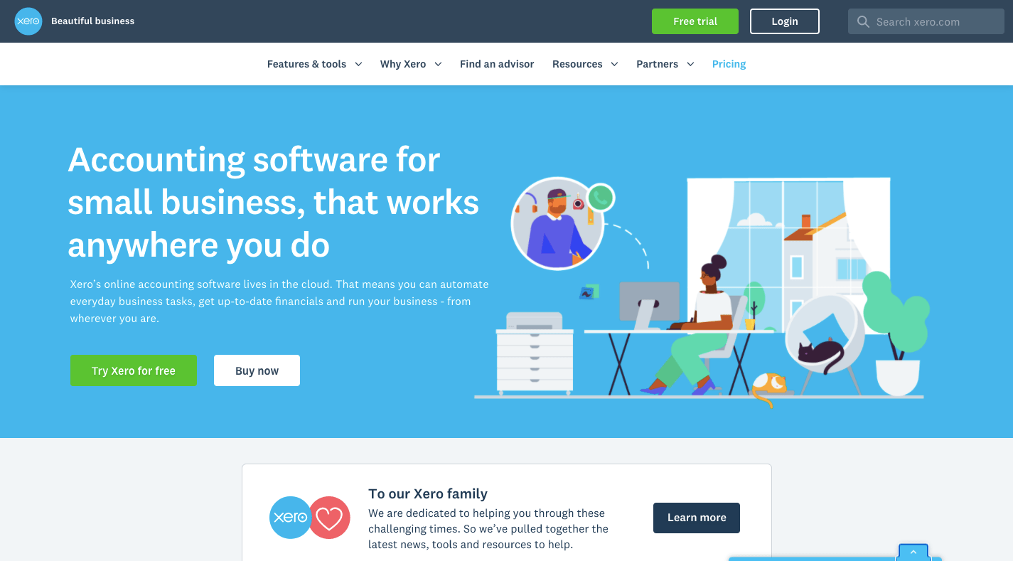 The home page for Xero accounting software lets small businesses know that the fintech solution is for them and that it “works anywhere you do.”