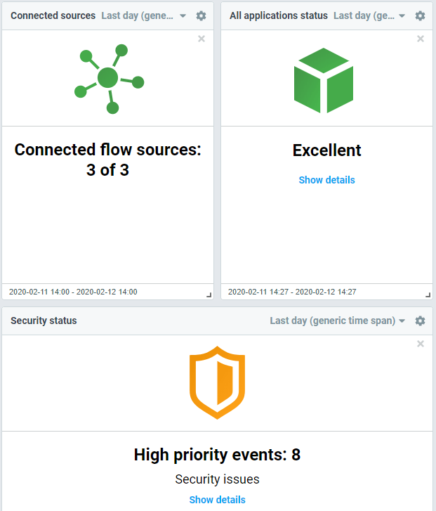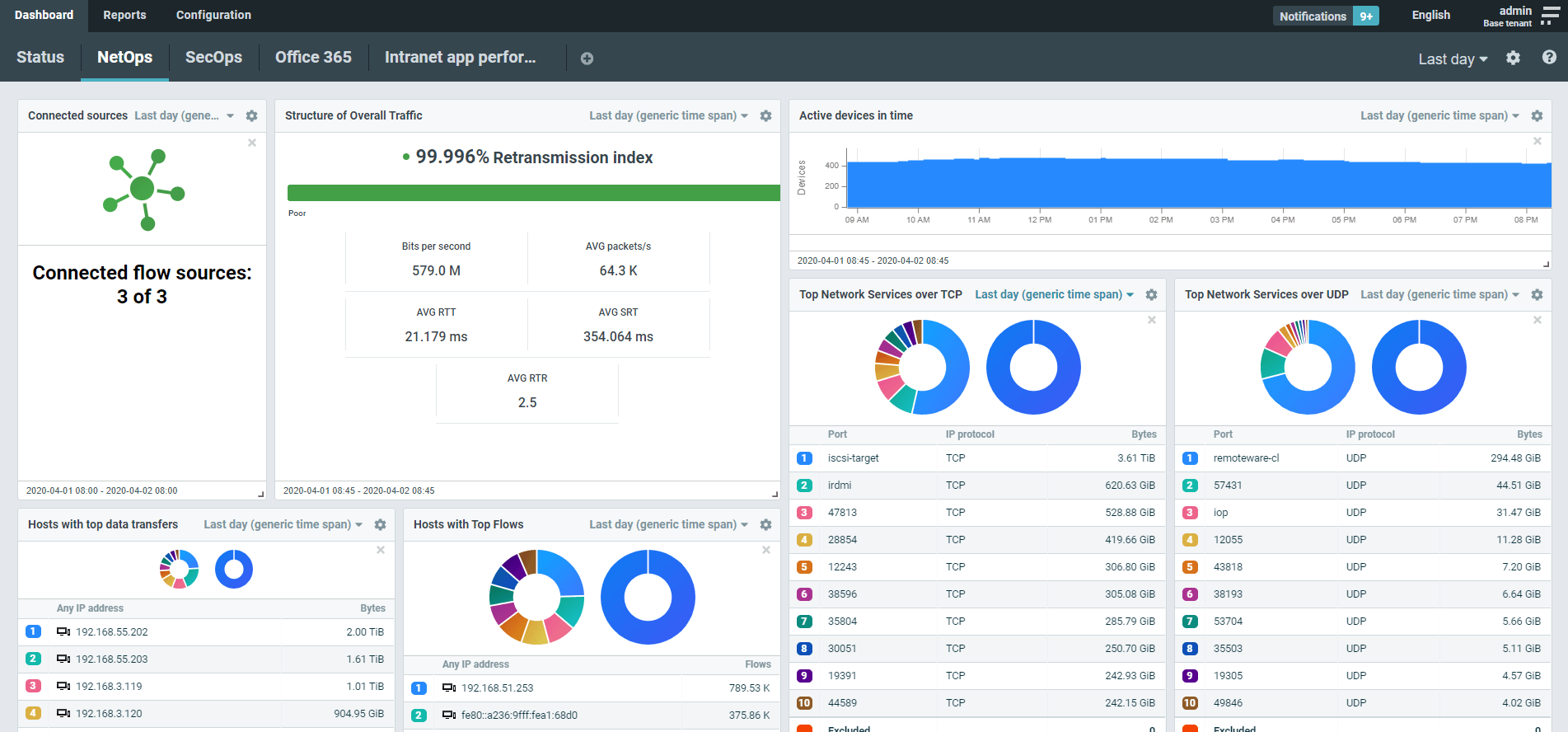 Predefined dashboards help to avoid time-consuming setup and to make sure that all the important information is visible. They reflect several of customers’ most common needs and allow choosing from status or use-case-oriented presets (such as NetOps, SecOps, Application, …), as well as dashboards optimized for network monitoring or security.