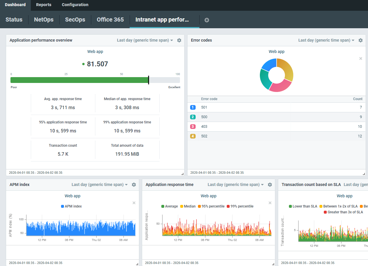 The system features configuration templates to streamline setup and ensure out-of-the-box functionality of the whole solution. For example, if you need to monitor Office 365 cloud applications, just browse the available templates, pick one for Office 365 and apply it. Straight away, the system is fully configured and ready to deliver data. All profiles, channels, chapters, dashboard widgets, and reports have been created automatically for you.