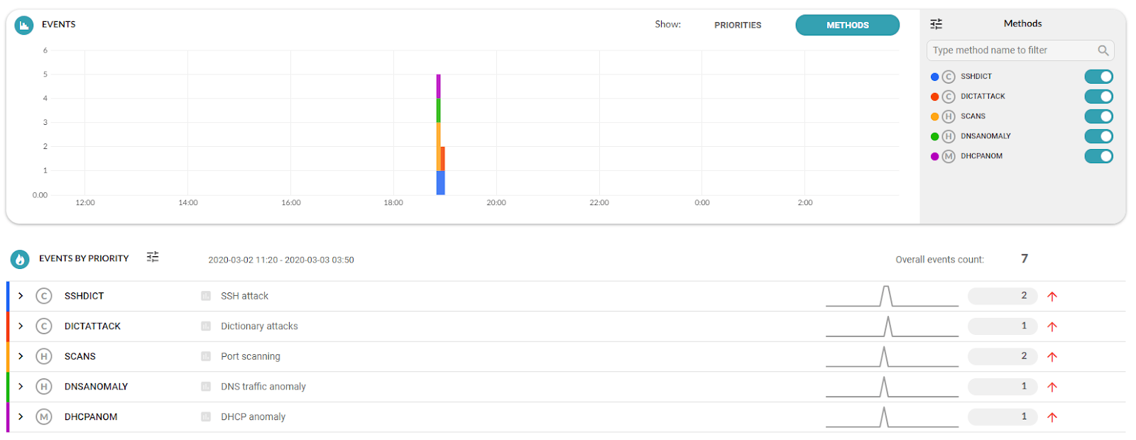 The following example shows the detection of events that correspond to individual anomalies and are categorised according to the character of network traffic that has been evaluated as anomalous. Each event is assigned a priority, and these events are grouped by category.
