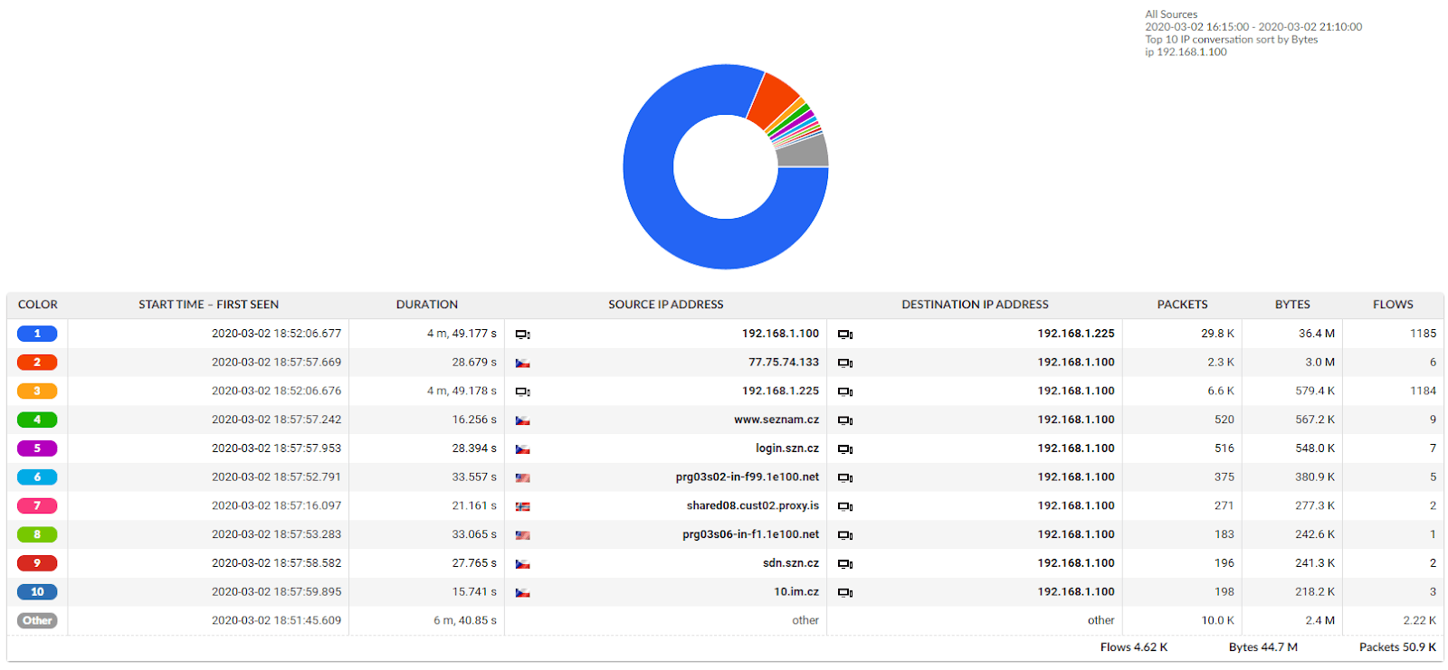 Using the information obtained in the previous step, we can identify all the communication on the data network of the attacker with the IP address 192.168.1.100 and present it in the form of a summary as a graph and as a detailed chart. In this way, we can identify all the communications, potentially affected systems and activity of the attacker and any other potentially compromised systems.