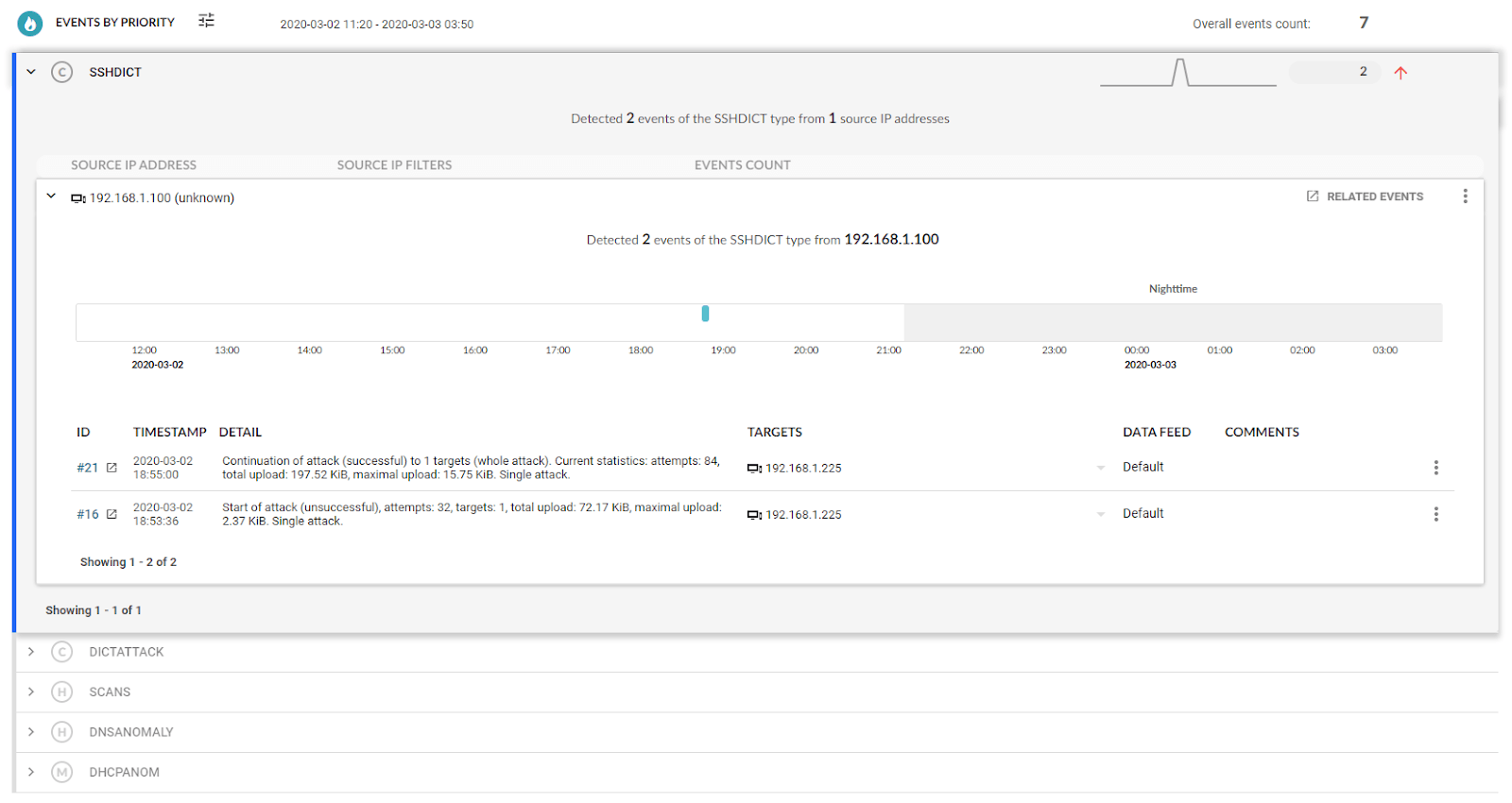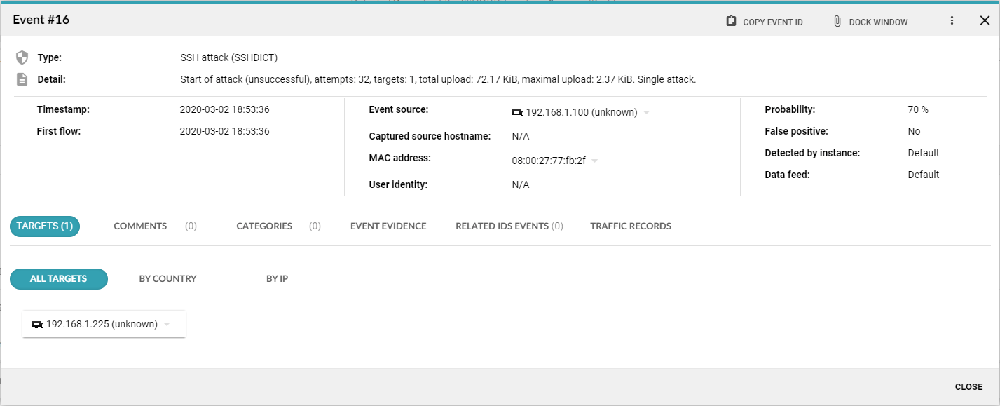 In the analysis of events we proceed according to the severity (for the events we see C = critical, H = high, ...) and analyse the individual categories of the events, the originator of the event and identify the device responsible for the event. Here, the most serious event is an attack on the SSH service to gain unauthorised access to a device or system on the network. The attacker is trying to compromise a larger number of devices in the network, gain persistent access, higher user permissions, etc. We have identified an attacker with the IP address 192.168.1.100 and the target of the attack with the IP address 192.168.1.225.