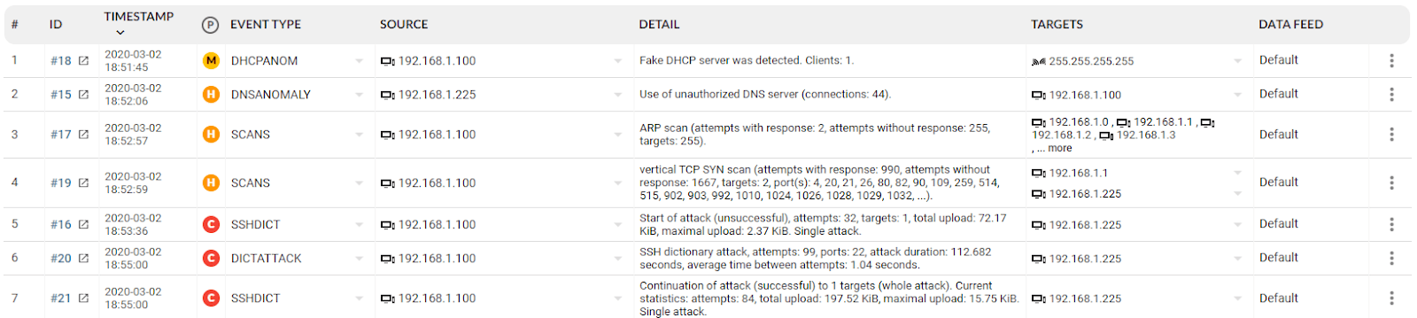 The example shows the IP address of an attacker or infected device that first simulated the DHCP server function and assigned a spoofed network configuration to the device 192.168.1.225. This fact is revealed in the following event where a device with an IP address of 192.168.1.225 is used by the attacker as a DNS server. The following activities of the attacker include identifying additional attack targets (ARP scan) and identifying services available on the gateway (IP 192.168.1.1) and on the victim (IP 192.168.1.225). The following activity is an attack on the SSH services to gain unauthorised access. This attack proves to be successful; the attacker presumably used information captured from the communication of the device 192.168.1.225 over the network.
