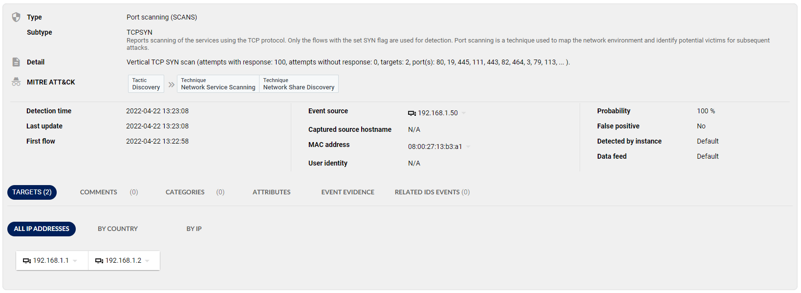 Figure 3: Detail of an event representing discovery tactic through a vertical TCP SYN scan conducted by a device with IP address 192.168.1.50 against two devices 192.168.1.1 and 192.168.1.2. This screenshot is from the Flowmon ADS page where WhatsUp Gold will navigate the user automatically when drill down is requested.