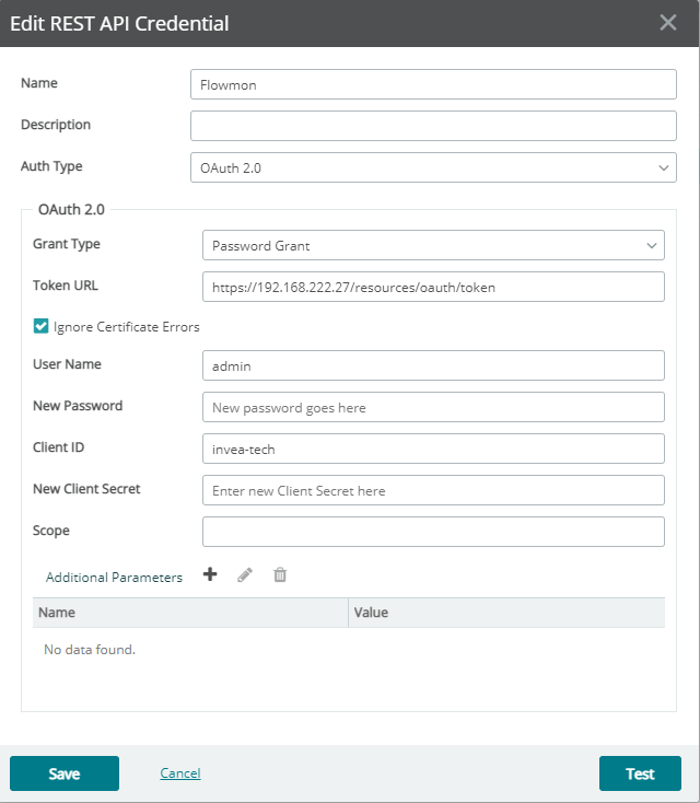 Figure 4: Flowmon REST API credentials. Token URL requires proper IP address or host name corresponding to your Flowmon deployment as well as login and password. No client secret is required. Client ID needs to be configured to “invea-tech” and authentication type is “OAuth 2.0”. If you are using a self-signed certificate on Flowmon side you need to enable “Ignore Certificate Errors”. However, proper security practice mandates to generate and use a trusted certificate through certification authority.