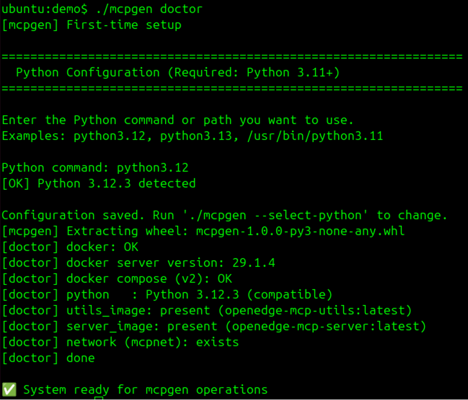 Use the mcpgen doctor command to confirm your configuration is ready. The tool will prompt you for your Python command and perform environment checks: