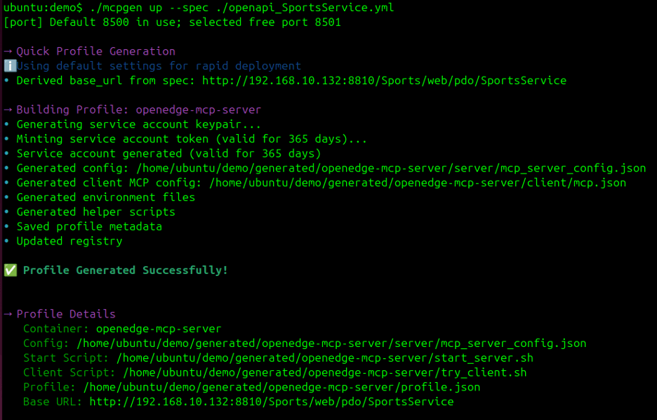 Once you have an OpenAPI spec (for example, openapi_SportsService.yml), spin up a new MCP Server instance: