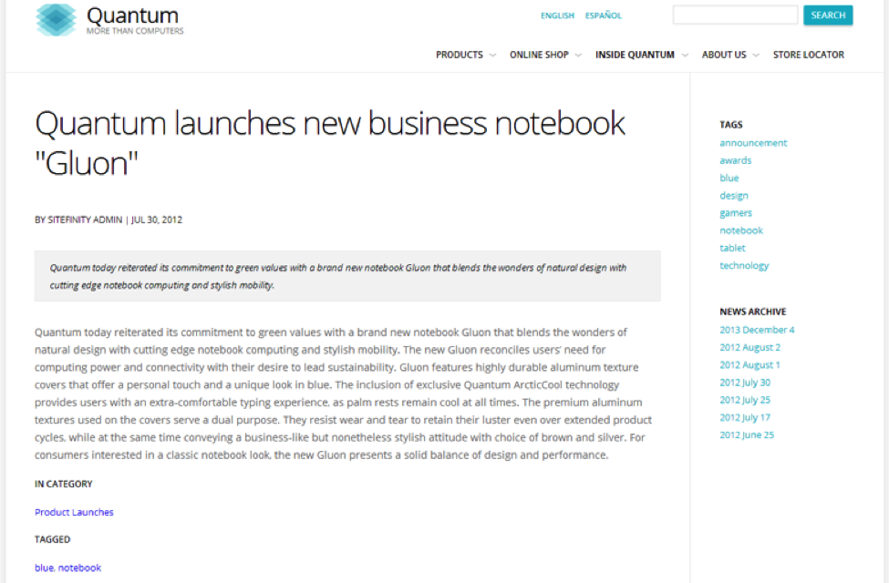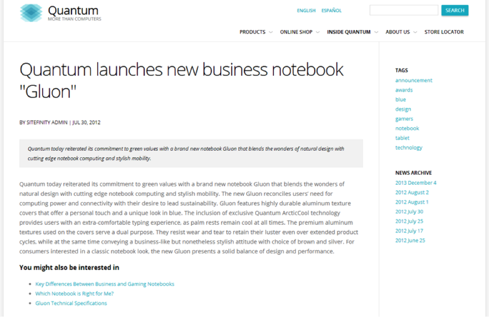 Let’s say that someone finds an article on your site titled “Quantum launches new business notebook ‘Gluon’”…and that they found it by searching for “best business notebook”. (Because you’re an SEO master!) Now, suppose they liked the article and wanted to view some more information but, because we rely on categories, tags the only options the visitor has are: