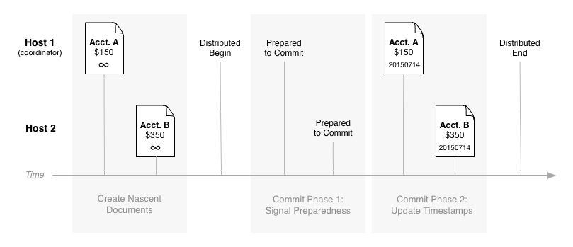 Once the hosts have signaled they are prepared, the coordinator writes a commit to the journal and syncs it to disk. Next, the coordinator communicates the commit to the other participants, who proceed to run their commits as well. This is the second phase of the two-phase commit. Timestamps are updated across all the hosts, similar to what happens in the nondistributed version on a single host.