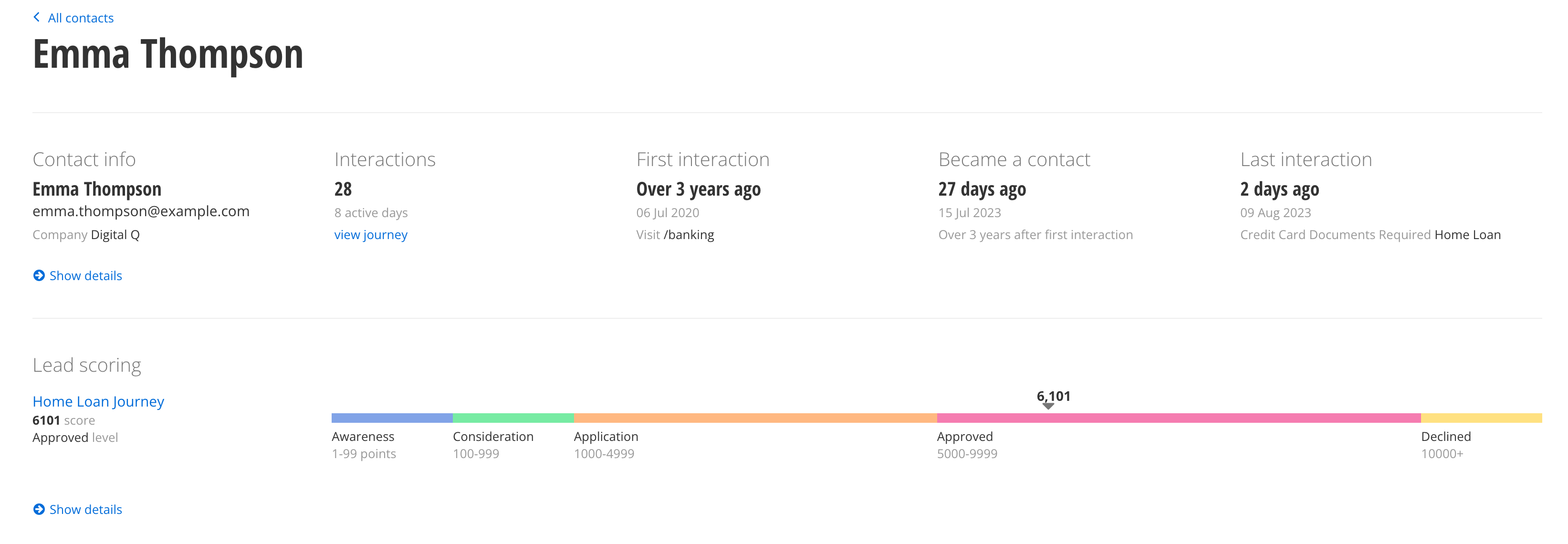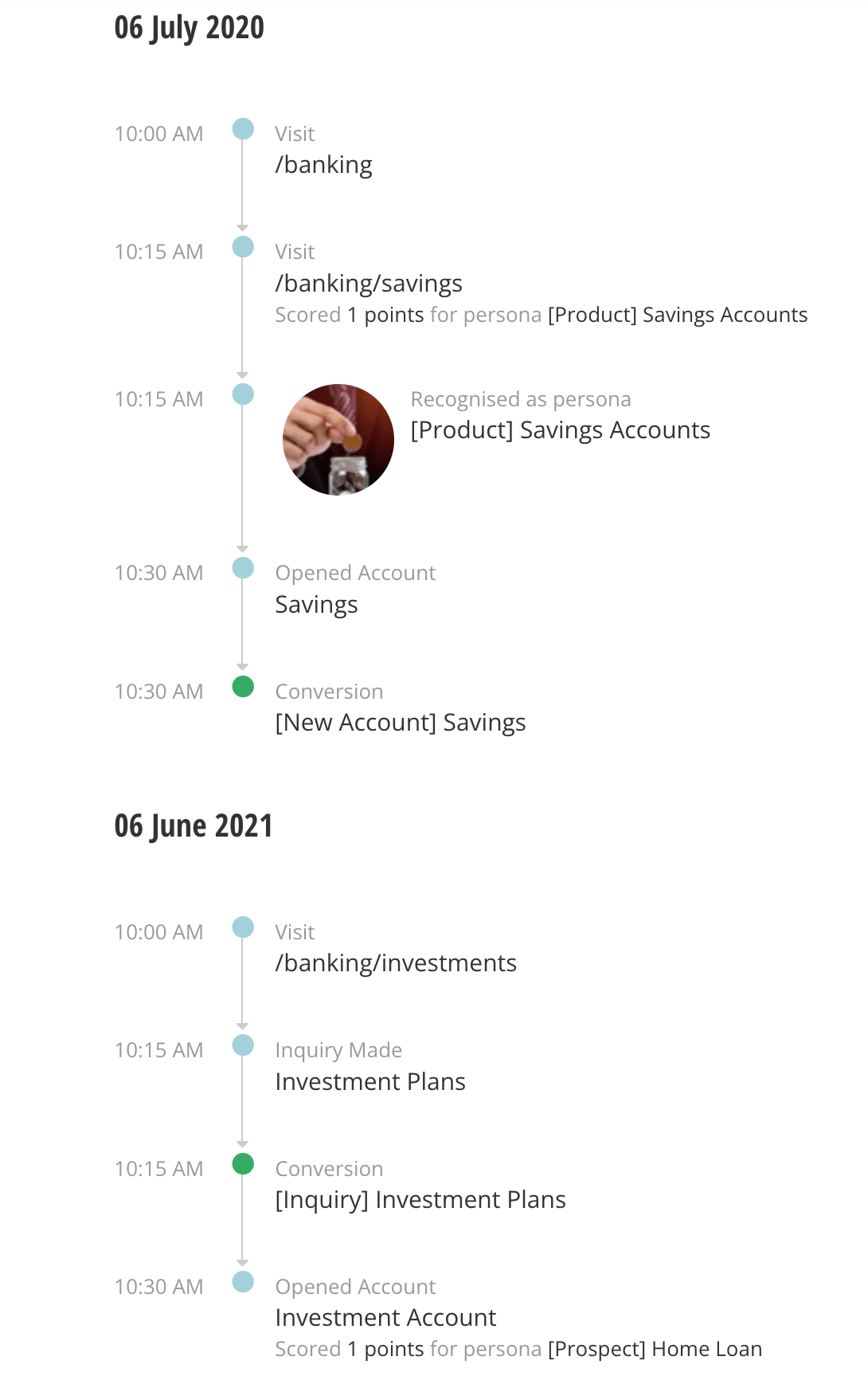 ![Timeline of user interactions on 06 July 2020 and 06 June 2021. On 06 July 2020: 10:00 AM: Visited /banking 10:15 AM: Visited /banking/savings; scored 1 point for persona [Product] Savings Accounts 10:15 AM: Recognized as persona [Product] Savings Accounts (includes image of hand placing coin in jar) 10:30 AM: Opened savings account 10:30 AM: Conversion recorded as “[New Account] Savings” On 06 June 2021: 10:00 AM: Visited /banking/investments 10:15 AM: Made inquiry about Investment Plans 10:15 AM: Conversion recorded as “[Inquiry] Investment Plans” 10:30 AM: Opened Investment Account; scored 1 point for persona [Prospect] Home Loan](/images/default-source/blogs/2023/2023-08/cdp/cdp---cusotmer-journey-analysis.png?sfvrsn=eaa1a710_3)