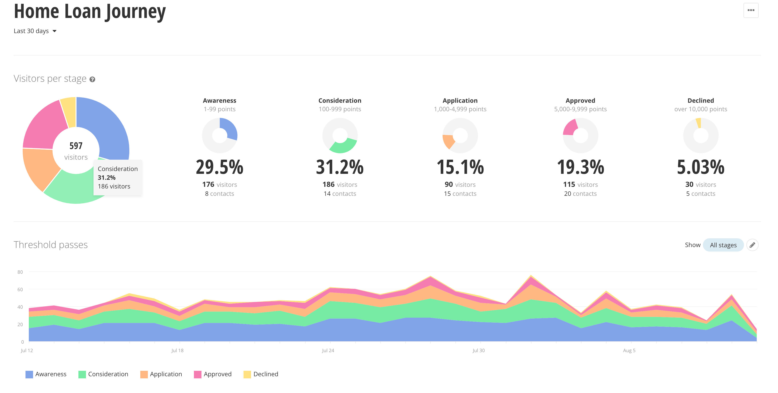 ![Dashboard for the “[Product] Home Loans” persona over the last 30 days. The distinctive characteristic is “Recently browsing home loans.” A total of 206 visitors passed the persona threshold, with 13 of them being contacts. This accounts for 2.37% of all visitors and 38.1% of all personas. A line chart titled “Visitors passed persona threshold” shows daily counts from July 12 to August 9, with values mostly ranging between 4 and 12 visitors per day.](/images/default-source/blogs/2023/2023-08/cdp/cdp---personas.png?sfvrsn=8eb920d7_3)
