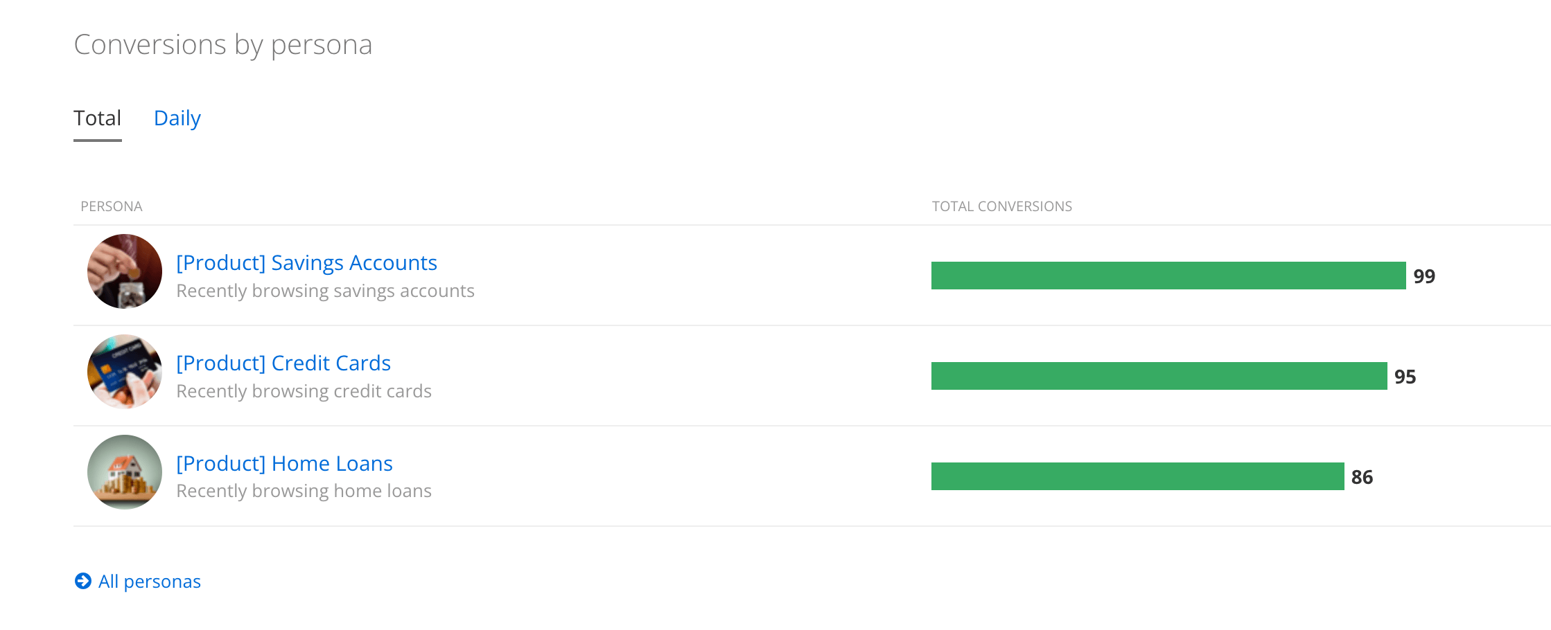 ![“Conversions by persona” with the “Total” tab selected. Three personas are listed: “[Product] Savings Accounts” with 99 conversions, “[Product] Credit Cards” with 95 conversions, and “[Product] Home Loans” with 86 conversions. Each persona includes a profile image, description of recent browsing behavior, and a green horizontal bar representing total conversions.](/images/default-source/blogs/2023/2023-08/cdp/cdp-campaign-performance.png?sfvrsn=b3b337bc_1)