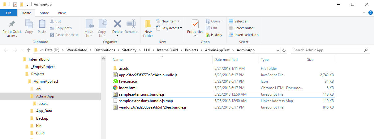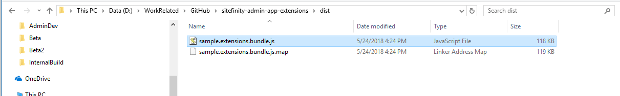 Once you are ready with the changes and want to apply them in your Sitefinity application, you need to build the project by typing “npm run build” in your CLI. The Admin App will generate a combined JS file with the proper mapping in the “/dist/” folder. The mapping file is used for debugging and it is optional to have it.