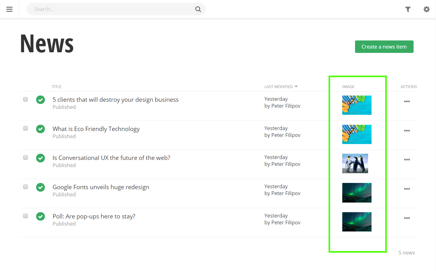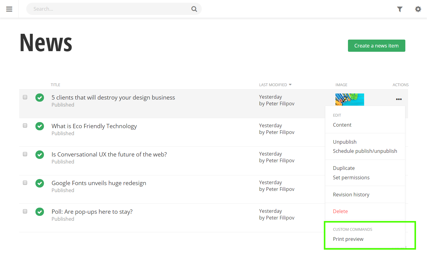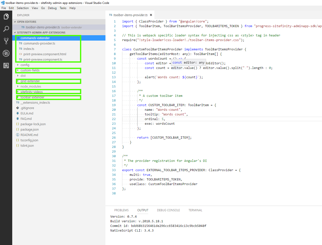 The idea is that only specific features are extendable and everything else is encapsulated. This way we will prevent unexpected behavior in the Admin App over time. There are four sample implementations – a new column in the grid showing random images, an action item in the context menu of a content item, a field to change the title and custom buttons in the toolbar showing the word count and the ability to insert videos from the Sitefinity libraries.