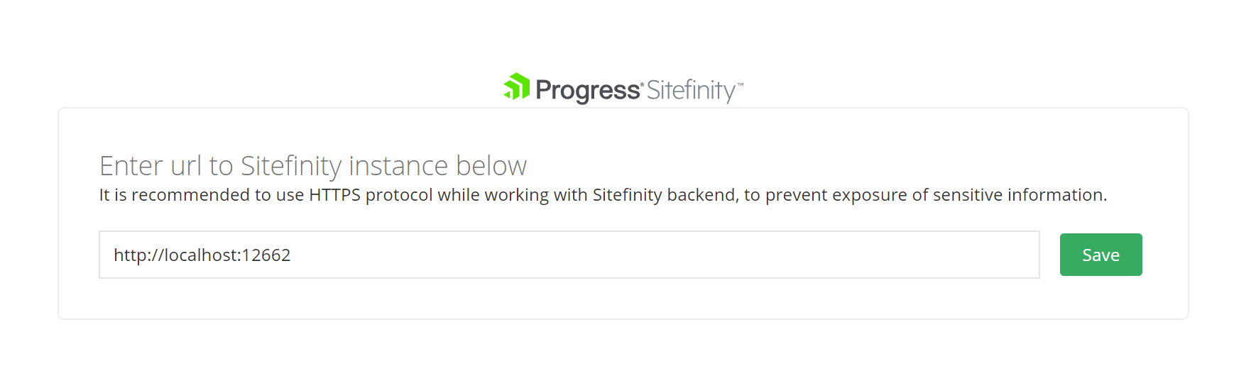 Now Sitefinity is ready to share data with the Admin App. Next, point your instance of the Admin App to Sitefinity. Open http://localhost:3000/config/ and paste the URL of the website in the input.