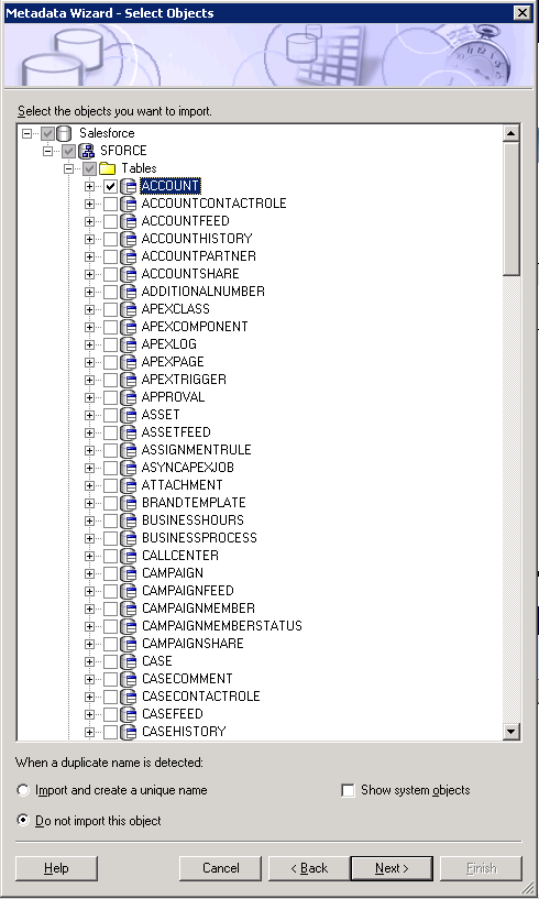 7. Select objects from Salesforce.com that you want to import into the Metadata Model.
