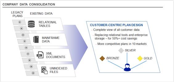 Pulling data from all these silos is extremely complicated, costly and long to build central data warehouses to have such a golden record due to physical model conception and ETL processes. And as soon as a source changes or a new source has to be integrated (which happens several times a quarter) the data model needs to be redefined. And semi and/or unstructured data – contracts, texts, social media — are out of the scope with traditional RDBMS approaches. One firm’s IT exec told us that a schema change could be an 18-month project. That’s 18 months delay to getting product to market. And this is exactly what insurance companies are struggling with – bringing new products to market and catching up with digitally-demanding consumers.