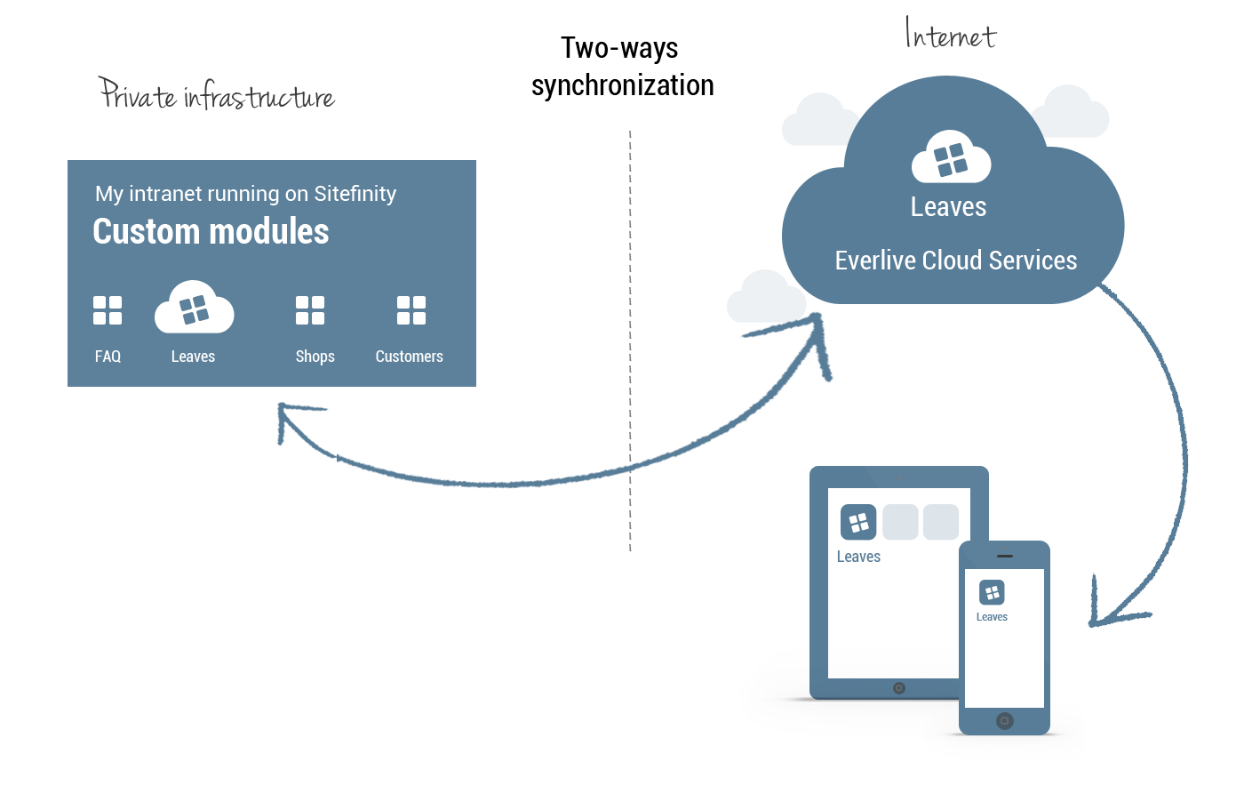 IT can address the scenario from Figure 1 with the help of Sitefinity. We would assume that Sitefinity Module Builder was used to create the leave requests management functionality on the company intranet portal that now needs to be exposed to mobile apps. The IT team can expose just the data for the “Leaves module” to the cloud by using the Sitefinity Cloud Services connector, which provides an automatic two-way data synchronization with the Telerik Everlive Cloud through RESTful web services. Then the IT Team can use the Sitefinity Mobile App Builder to easily create a hybrid mobile app based on the Leaves module. The mobile app will then be able to talk to the cloud services and all leave request submissions will be synced back to your company intranet (Check out FranklinCovey Company Intranet, winner of Best Sitefinity Intranet of the Year award).