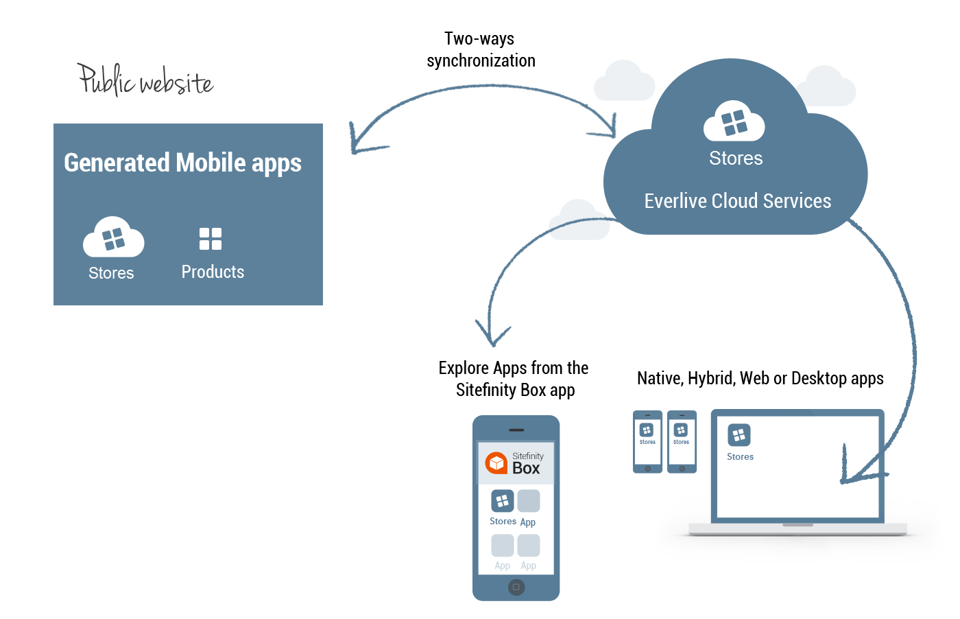 In this case the IT team could also rely on Sitefinity to quickly build a custom module called "Stores" using the Sitefinity Module Builder and then use the Sitefinity Mobile App Builder to create a hybrid mobile app for this module. That way all information and new stores that the marketing team publishes on the website will automatically be available on the mobile app, which uses the same data source. This is all great and the IT team predicts that the mobile app will quickly become popular and cause a heavy load on the website traffic. One way to plan for this is to buy additional website hosting infrastructure that is hard to scale and every expensive. Another option they could choose is to use the Sitefinity Cloud Services connector, sync the Stores module with the cloud, and point the mobile app to the cloud services. In this case the hybrid cloud solution helps to separate the mobile app traffic load from the company website servers and direct this load to the cloud services, which are designed to scale and optimized for ultimate performance.