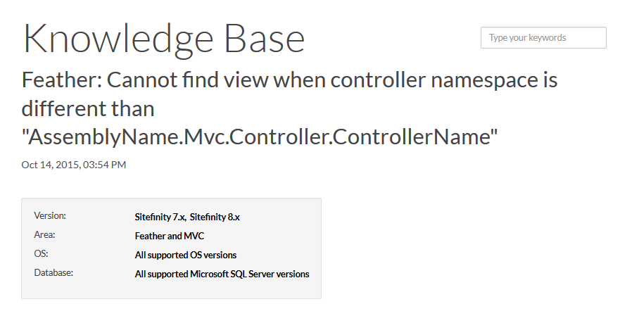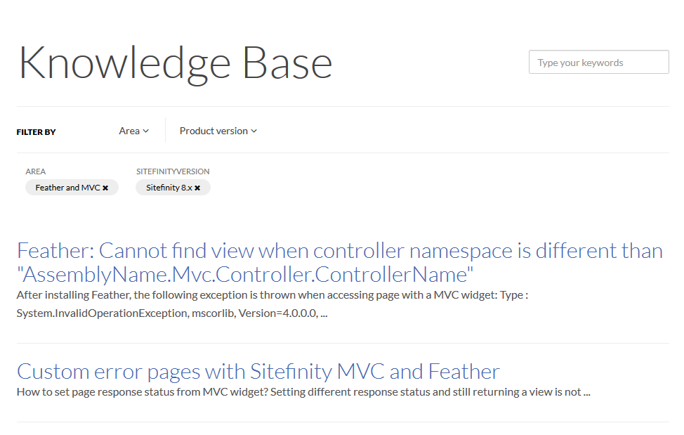 You are looking for something specific and filtering out the results is not enough to find it? Just type your keywords in the Search bar and enjoy the instantaneous search results. The Sitefinity Knowledge base search searches through the KB articles using a Google Search Appliance, so you do not need to change your search habits – do it as if you are searching on Google.