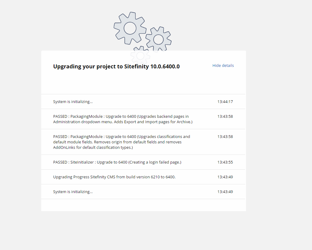 Keep in mind that if any of the modules failed the upgrade procedure, a message will be logged in the UpgradeTrace.log (located in Your Project > App_Data > Sitefinity > Logs), so make sure you check it as well.