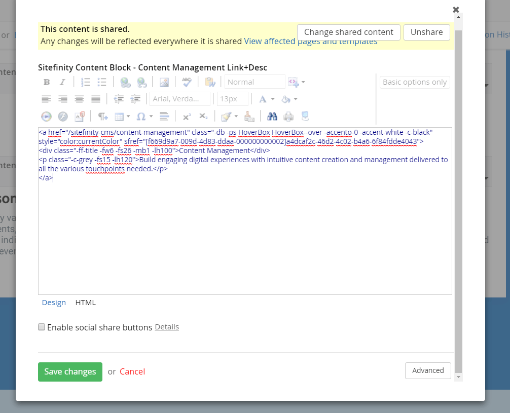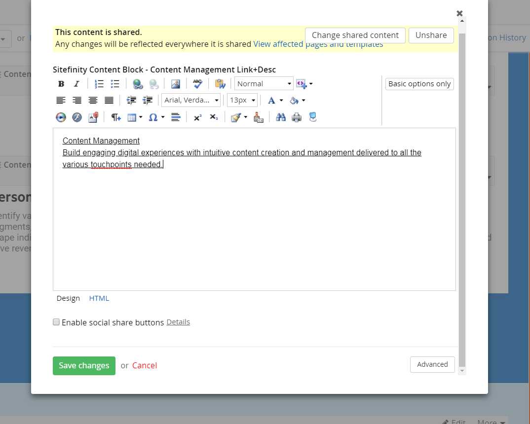 Clicking on the pencil launches the WYSIWYG editor where you can create or paste text, add styling, images, and leverage a full menu of formatting options. If your content is shared across pages or entire properties, you can dynamically change it everywhere or pick and choose what will change and where.