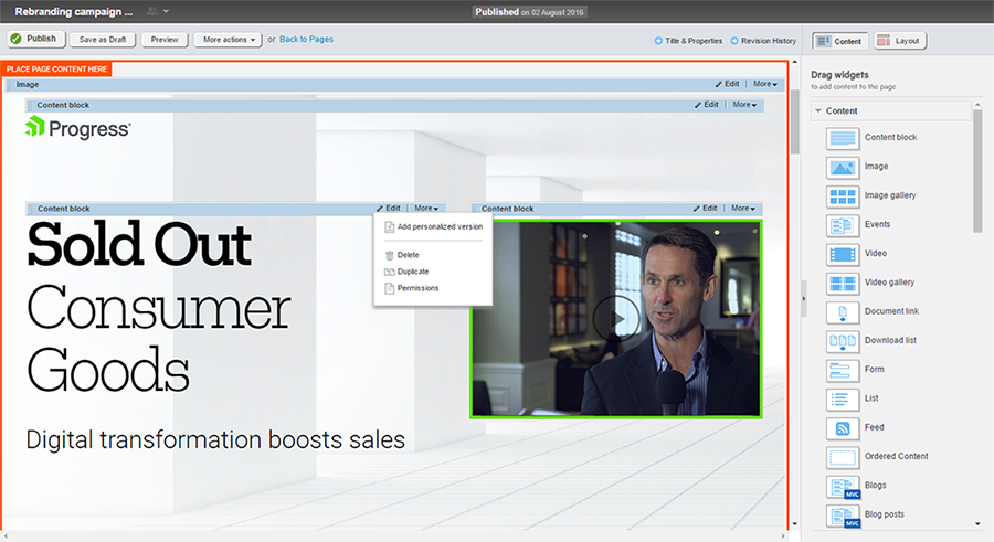 At Progress, we are happy to use our own Sitefinity CMS, which enables the campaign manager to easily edit, preview and publish the campaign page, all without the help of a developer. The templates and drag-and-drop functionalities enable marketing experts to change the campaign creative, messaging, featured content assets and CTA labels in a matter of clicks. Marketing experts can create a brand new landing page effortlessly, all while preserving consistency and alignment with the brand design language and styles.