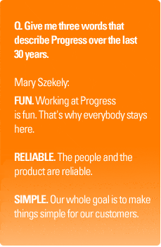 Mary: Every single person who works here works really hard and they do their job well. I'm talking about people in your department as well as mine. It's the only way you stay alive for 30 years. Every single person has to do the best that they can, every day, without supervision, just because out of their heart they want to do the best job that they know how to. And to me that's what defines a Progress employee. Every time I get to talk to them I commend them for being very faithful to our work ethic. I've never found an engineer at Progress that just doesn’t care.