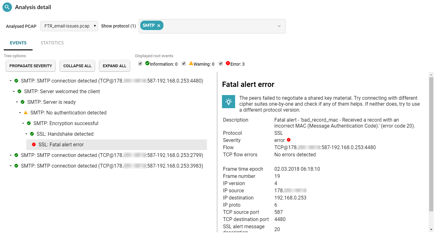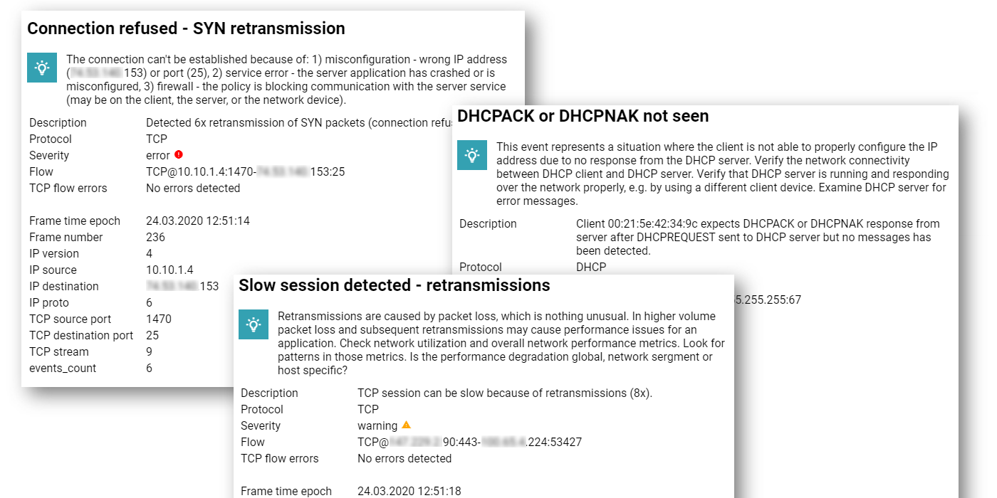 It then runs a decision-tree analysis to get to the root of the issue by seeking deviations from the RFC specifications of the respective protocols and their combinations and dependencies. Any specific protocol states, failures or error codes are identified and compared against extensive databases to be translated into an intelligible message including a recommendation for a course of action.