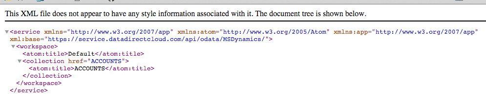 Once authenticated, the response you should see is XML with Service and Workspace info populated. You will notice the the collection ACCOUNTS appears. This is the same table that we selected while configuring the Schema. At this point we are ready to configure Tableau to consume the Dynamics data via OData.