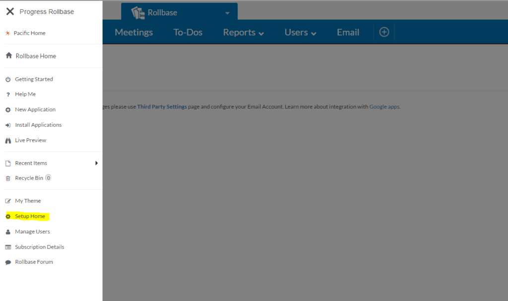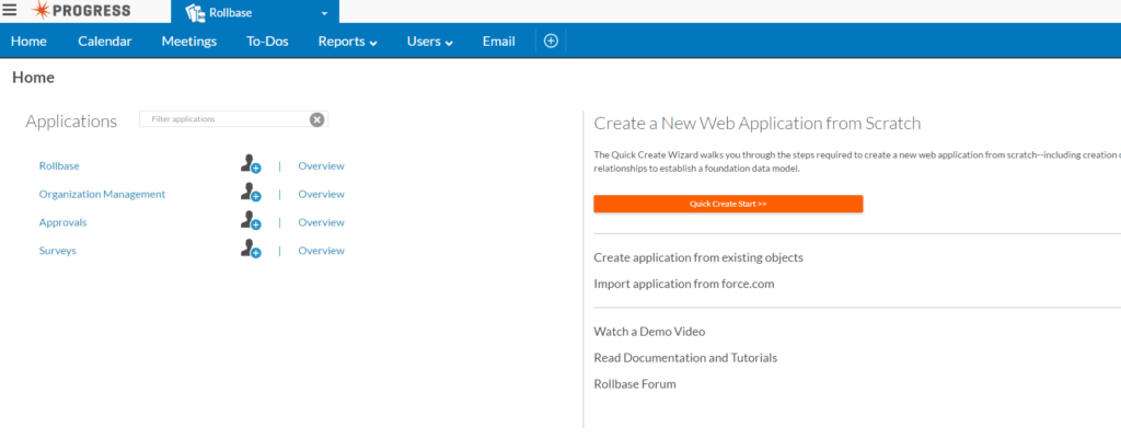 Once you log in to your account in Rollbase, you will see the Home screen: