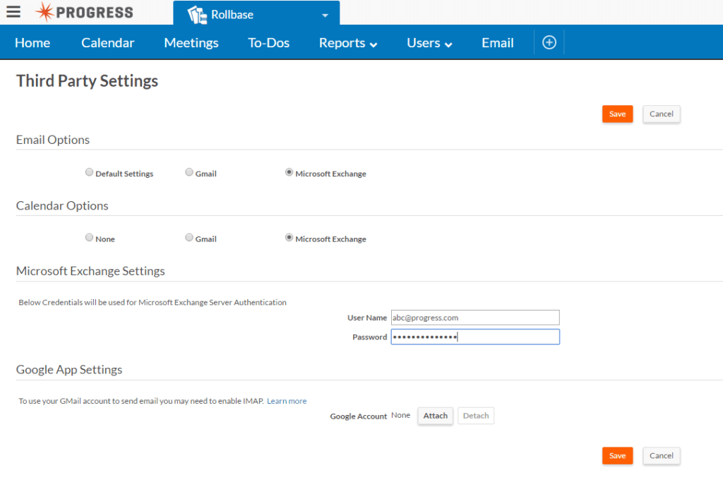 To configure Exchange, all you need to do is to provide your username and password and that’s it. Rollbase uses Exchange’s Auto-discovery feature to connect to the appropriate exchange server based on your credentials.