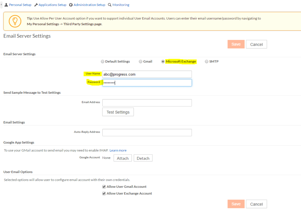 While configuring tenant level Exchange credentials, you'll see options to allow/disallow per user email account configuration in the ‘Email Server Settings.’ The default value is to allow users of the tenant to be able to configure their own Exchange credentials. If unchecked the users will not be able to configure their own credentials. This is a security feature put in place for use when needed.