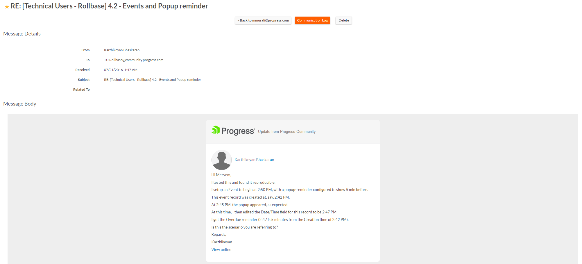 If an email was sent as part of the record creation in Rollbase then the ‘Related To’ field in this page will have a link to the record.