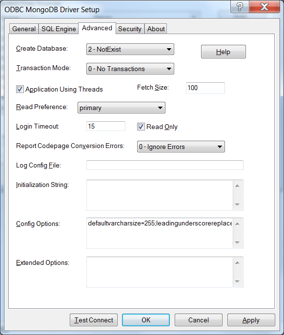 ODBC MongoDB Driver Setup, Advanced Tab Settings