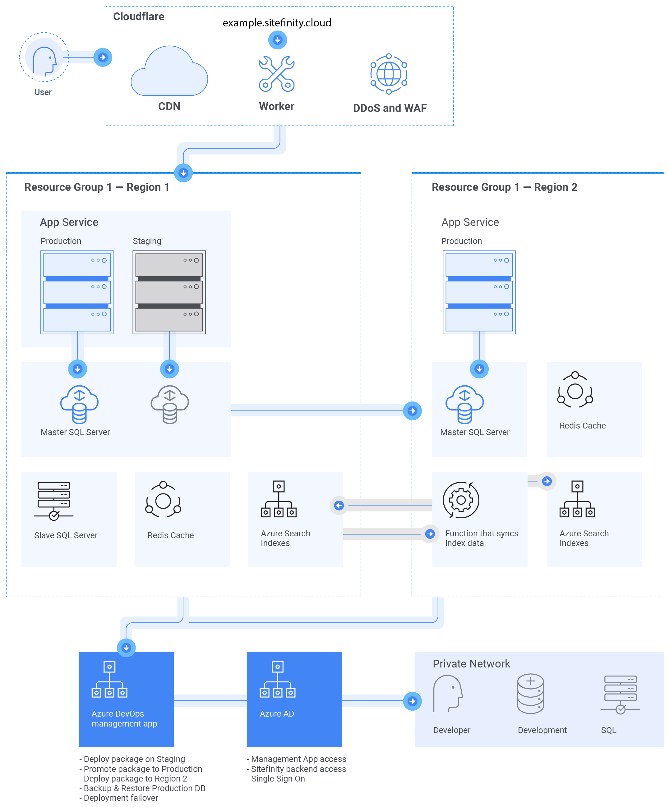 Another important thing to note is how Failover clicks with CDN. Sitefinity Cloud employs Cloudflare’s content delivery network, a geo-distributed system of servers for ultrafast delivery of content and media. The assets served by Sitefinity are cached under these CDN nodes, which are fully autonomous of the server hosting the Sitefinity application.