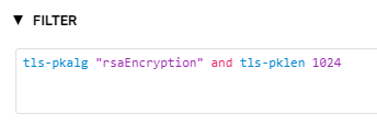 As we can see most of the encrypted traffic is using RSA with 2048-bit length, followed by ECC with 256-bit length (which is a rough equivalent to RSA 2048-bit) and followed by RSA with 4096-bit keys. This is good news, since it's recommended to use 2048-bit keys for RSA (Qualys Grading). However, there is still a small amount of traffic with only 1024-bit RSA keys. We can use filters to focus only on this traffic:
