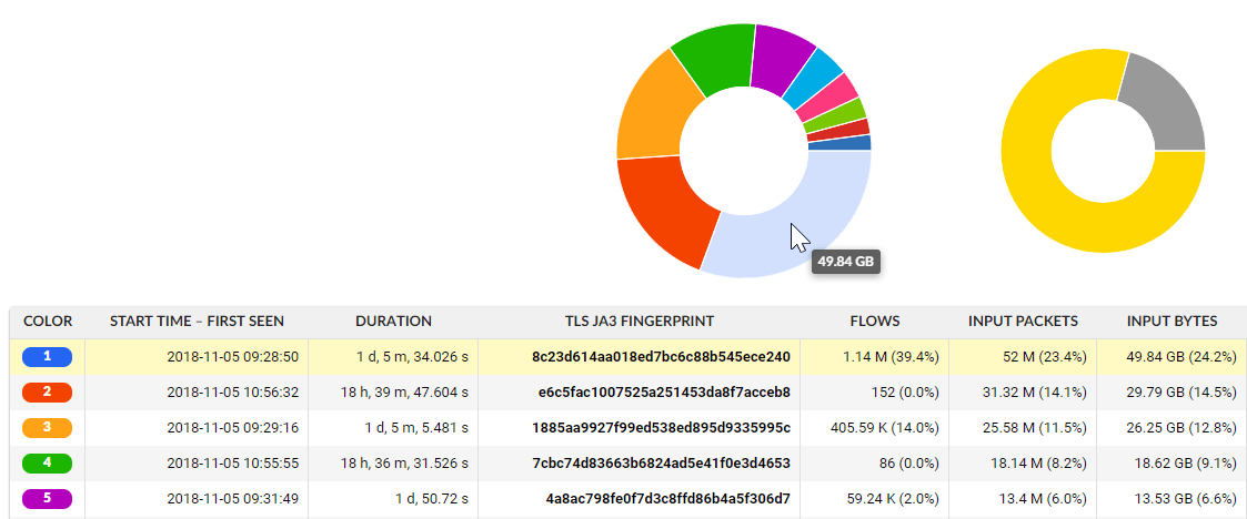 One of the easiest way to spot malicious threats or at least to provide an indicator of compromise (IoC) is JA3 fingerprinting, named after its three authors with identical initials "J.A.". This experimental method combines these five parameters of TLS communication: version, ciphers, extensions, elliptic curves and its formats and produces a MD5 hash. This is our JA3 fingerprint. Interestingly, this is enough to identify various clients. For example, "e7d705a3286e19ea42f587b344ee6865" is the JA3 fingerprint for a standard TOR client. The reasoning behind this method is the idea that tools are more difficult to change than IP addresses or domain names. This method is very much in the field of signatures, and as such is highly reliant on available blacklists and whitelists. Nevertheless, you can leverage it to find outliers and other oddities in your network.
