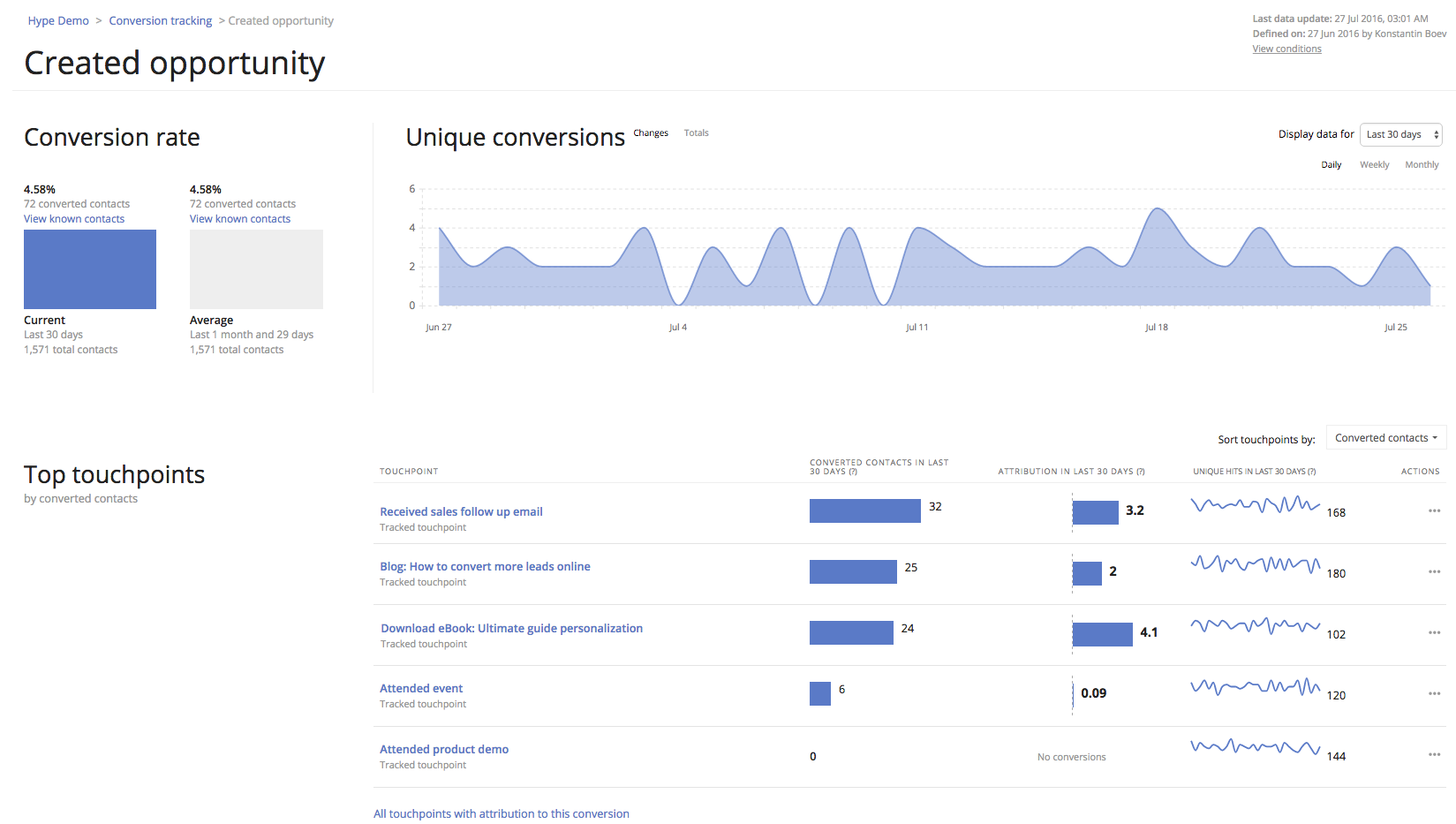 ● Converted contacts in last 30 days—This shows how many contacts have hit the touchpoint and then converted within the period