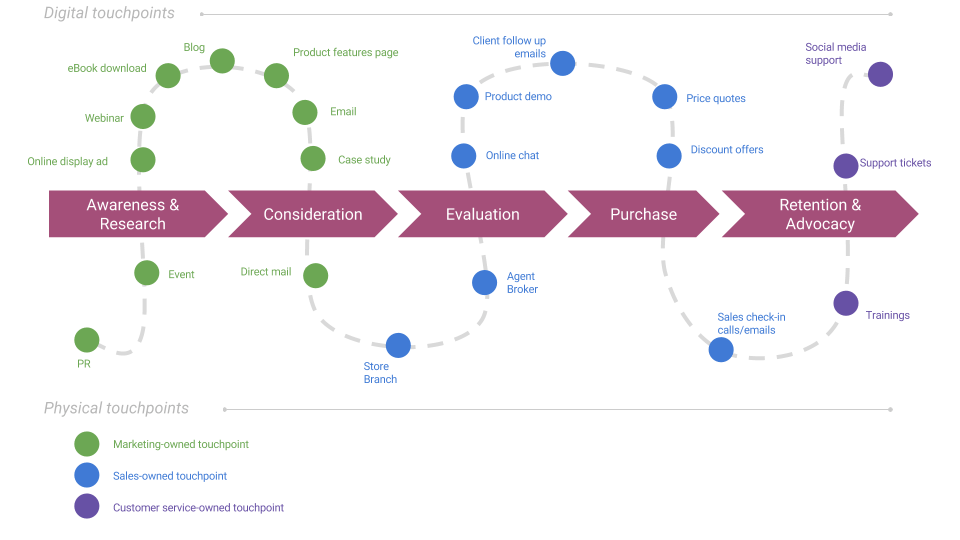 To first step towards creating accurate attribution tracking is to map the customer journey for the typical customer in your industry. This journey is a map of all touchpoints your prospects have with your company before and after they purchase your product. Touchpoints are basically interactions with your company across all channels a customer uses to research, evaluate or purchase a product. They can be online, like downloading a whitepaper, visiting a blog or requesting pricing information from your website; or offline like attending an event or calling a sales rep. Here is a sample customer journey map: